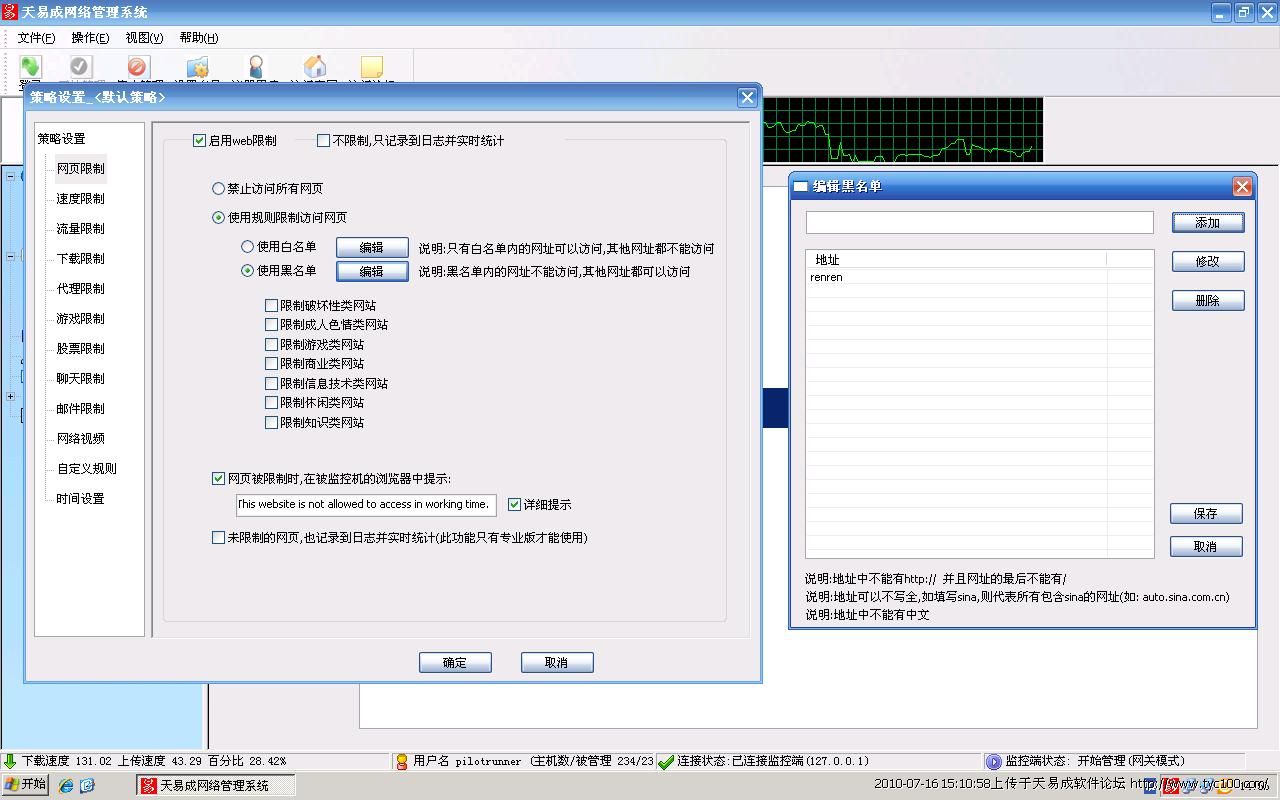 网关模式,在监控机上设置“网页设置”-“启用web限制”-黑名单“renren”。
