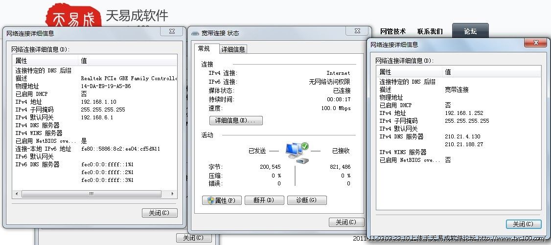 已知本地连接IP地址是192.168.1.10,子网掩码是255.255.255.255,网关是192.168.6.1,路由ip地址是192.168.6.1,本机通过宽带连接连上路由的,路由是winbox软路由,路由给宽带连接分配到的IP地址是192.168.1.252,子网掩码是255.255.255.255。本地连接和宽带连接截图在附件。请问这样的网络能使用天易成软件管理吗?