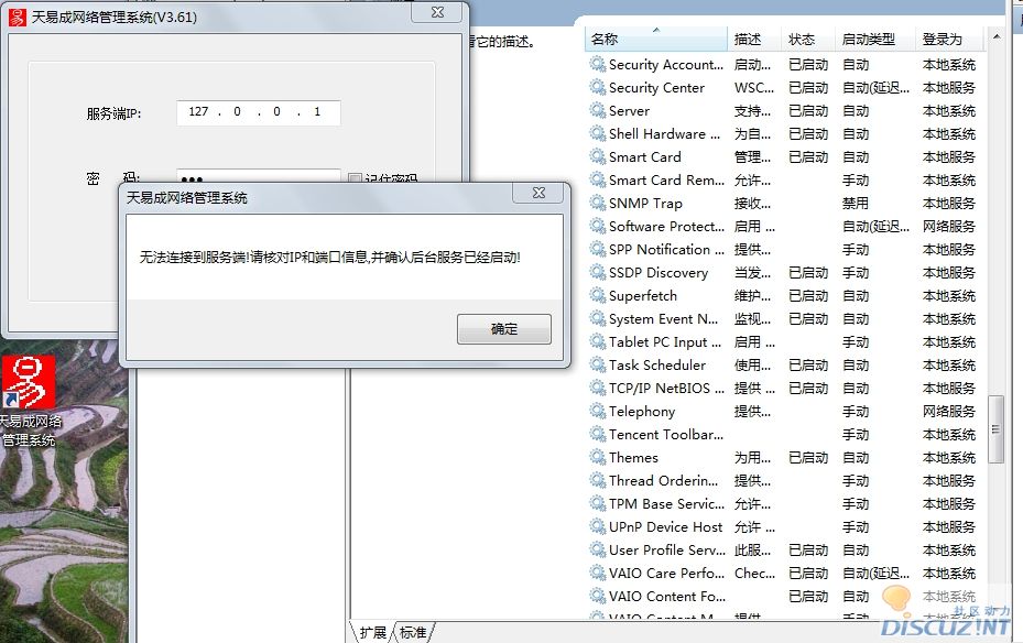 2.点我的电脑--右键--管理--服务和应用程序--服务,找到TYCNetManageService,查看其状态,状态必须为"已启动",如果没有该服务就重装一次软件,就会重装服务。