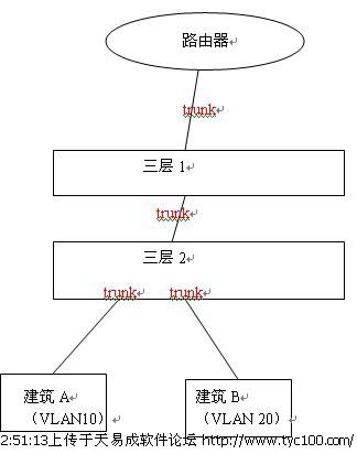 如附件中的网络拓扑,网络中心有一个路由器,下接两个三层交换机(堆叠当一个用),三层下分另接两幢建筑,楼道交换机中划了VLAN,通过光纤连到三层(都是TRUNK相连),现在欲布置天易成来管理VLAN20,而VLAN10不用管理,试用了天易成的虚拟网关模式,发[color=Red]现VLAN20的用户可以把网关改成VLAN10的网关就可以绕过天易成[/color]。之所以未采用网桥模式是发现用天易成连接后,网络延时很大,原因vlan20的客户机ping路由器内口的IP延时都是1ms以下,但装上后延时普遍在70以上,甚至达到600多的。